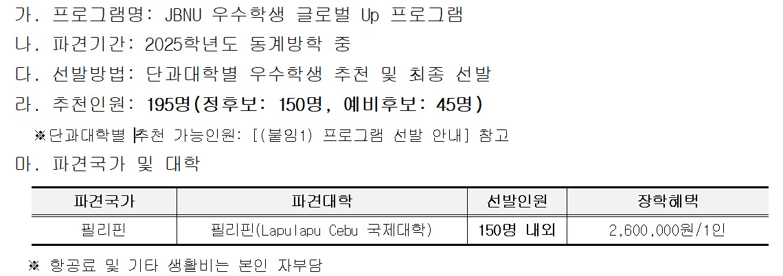 우리대학에 재학중인 단과대학별 우수 재학생을 선발하여 해외 연수 경험을 제공하고, 글로벌 역량 강화를 위해 <2025학년도 동계 JBNU 우수학생 글로벌 Up>프로그램을 운영할 예정이오니, 관심 있는 학생들의 많은 참여 바랍니다.