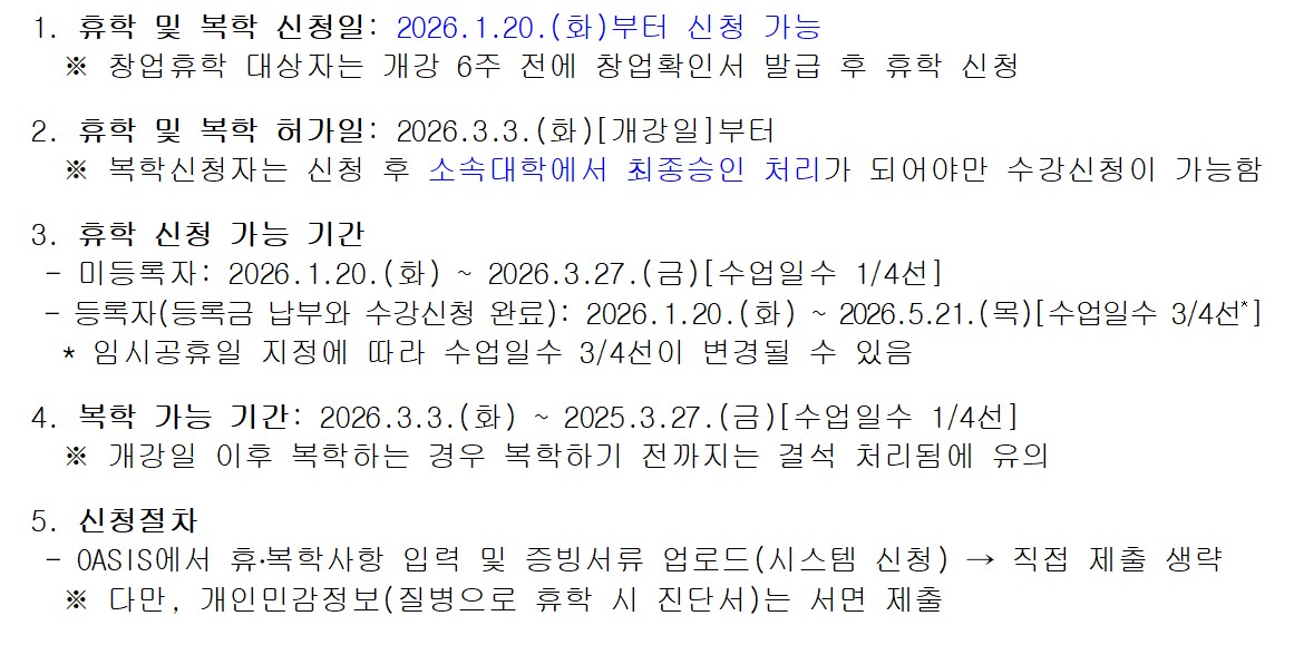 2026학년도 제1학기 휴학 및 복학 신청기간 등을 아래와 같이 안내 드립니다.