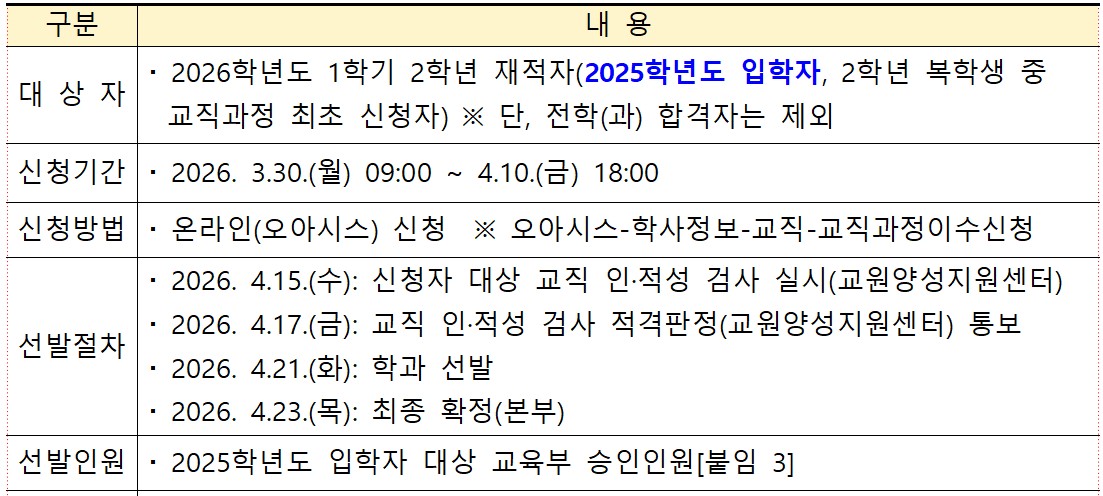 2026학년도 교직과정 이수 대상자 선발 일정을 아래와 같이 안내 드립니다.
